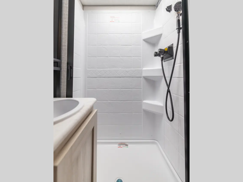 Each one is built with a sealed underbelly with forced heat for added protection against the elements, plus a curved dual-pane acrylic front window with a bug screen and night shade for great outdoor views and natural lighting. You will also find seamless Surf-X kitchen countertops, a central vacuum system, blackout roller shades throughout, and many more comforts.