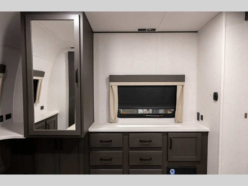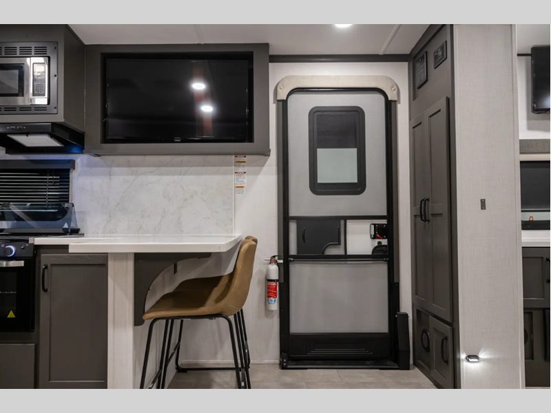 Outside, you'll find a power awning with an adjustable rain dump and LED lighting, backup camera pre, Keyed Alike locks, plus many more conveniences. The enclosed underbelly will help extend your camping season, and you can enjoy your RV for years thanks to the durable construction materials, like the radiant foil insulation and 5/8" plywood tongue and groove subfloor. Each fifth wheel and travel trailer also includes lino flooring in all slides, aluminum dinette, bed and bunk, plus solid surface kitchen countertops.