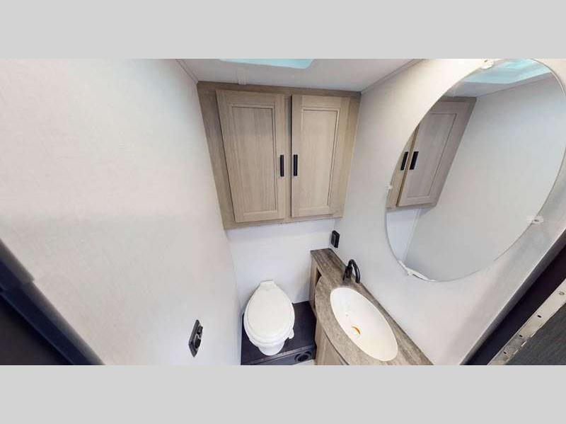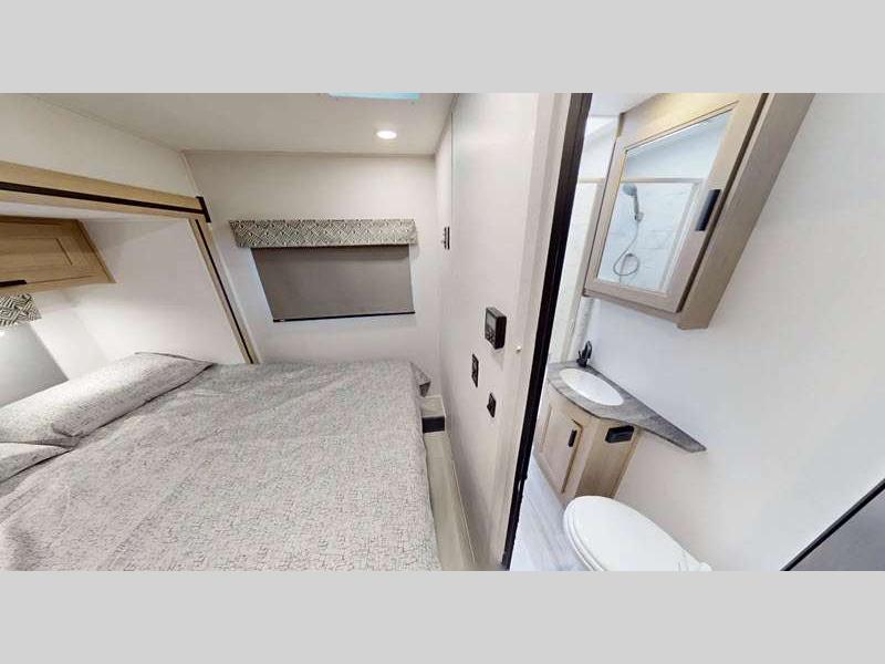 The exterior consists of a fiberglass roof, a one-piece seamless fiberglass cap, slide-out awnings, an integrated entry step, and 2"aluminum framed lamited sidewalls with lightweight composite waterproof material. The sideview and backup cameras will help you park your coach, and the high-pressure oxygen-infused shower head will give you a pleasant shower experience. You'll also have a Maxx Air multi-speed power fan with cover in the kitchen, and another kitchen feature you'll love is the 1.3-cubic foot convection microwave. You also have the ability to add an optional solar-powered 12V charging system.