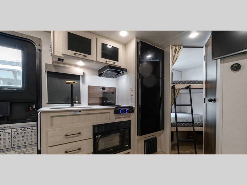 Sleeps 5 Slides 1 Length 23 ft 7 in Ext Width 7 ft 4 in Ext Height 10 ft 9 in Hitch Weight 408 lbs GVWR 5608 lbs Dry Weight 3777 lbs Cargo Capacity 1831 lbs Fresh Water Capacity 30 gals Grey Water Capacity 30 gals Black Water Capacity 30 gals Number Of Bunks 2 Available Beds Queen Refrigerator Type 12V Black Glass Refrigerator Size 10 cu ft Convection Cooking Yes Cooktop Burners 2 Number of Awnings 1 Water Heater Type Tankless AC BTU 15000 btu TV Info LR HD TV Awning Info 15' Electric w/LED Light Strip Axle Count 1 Shower Type Standard Electrical Service 30 amp Solar Wattage 200 watts Similar Floorplans