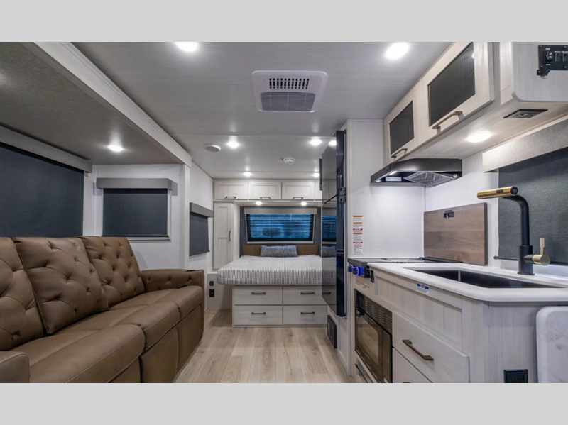 Sleeps 2 Slides 1 Length 30 ft Ext Width 8 ft Ext Height 11 ft 3 in Hitch Weight 705 lbs Dry Weight 6108 lbs Cargo Capacity 1597 lbs Fresh Water Capacity 40 gals Grey Water Capacity 60 gals Black Water Capacity 30 gals Available Beds Queen Refrigerator Type 12V Black Glass Refrigerator Size 10 cu ft Cooktop Burners 3 Number of Awnings 1 Water Heater Type Tankless AC BTU 15000 btu TV Info LR HD TV Awning Info 18' Electric w/LED Light Strip Axle Count 2 Shower Type Standard Similar Floorplans